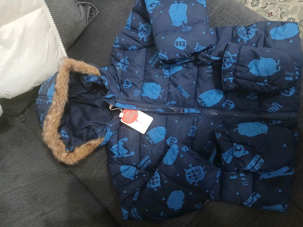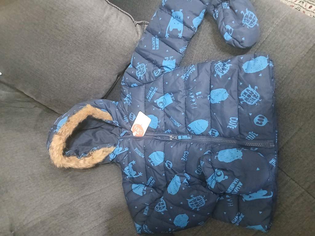 Коттон, посл размер, на 2-3 года, на мальчика,теплая куртка с капюшоном и варежками,цвет синий.