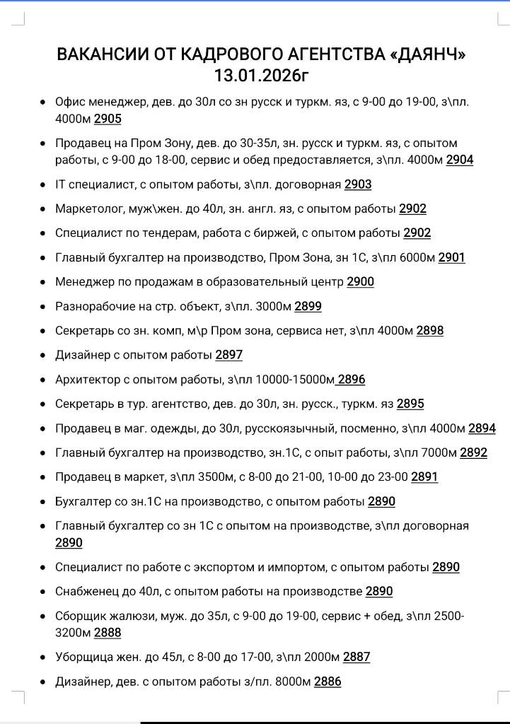ВАКАНСИИ ОТ КАДРОВОГО АГЕНТСТВА «ДАЯНЧ» 13.01.2026г Офис менеджер, дев. до 30л со зн русск и туркм. яз, с 9-00 до 19-00, з\пл. 4000м 2905 Продавец на Пром Зону, дев. до 30-35л, зн. русск и туркм. яз, с опытом работы, с 9-00 до 18-00, сервис и обед предоставляется, з\пл. 4000м 2904 IT специалист, с опытом работы, з\пл. договорная 2903 Маркетолог, муж\жен. до 40л, зн. англ. яз, с опытом работы 2902 Специалист по тендерам, работа с биржей, с опытом работы 2902 Главный бухгалтер на производство, Пром Зона, зн 1С, з\пл 6000м 2901 Менеджер по продажам в образовательный центр 2900 Разнорабочие на стр. объект, з\пл. 3000м 2899 Секретарь со зн. комп, м\р Пром зона, сервиса нет, з\пл 4000м 2898 Дизайнер с опытом работы 2897 Архитектор с опытом работы, з\пл 10000-15000м 2896 Секретарь в тур. агентство, дев. до 30л, зн. русск., туркм. яз 2895 Продавец в маг. одежды, до 30л, русскоязычный, посменно, з\пл 4000м 2894 Главный бухгалтер на производство, зн.1С, с опыт работы, з\пл 7000м 2892
