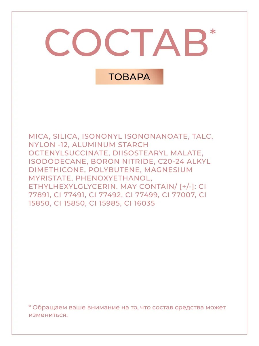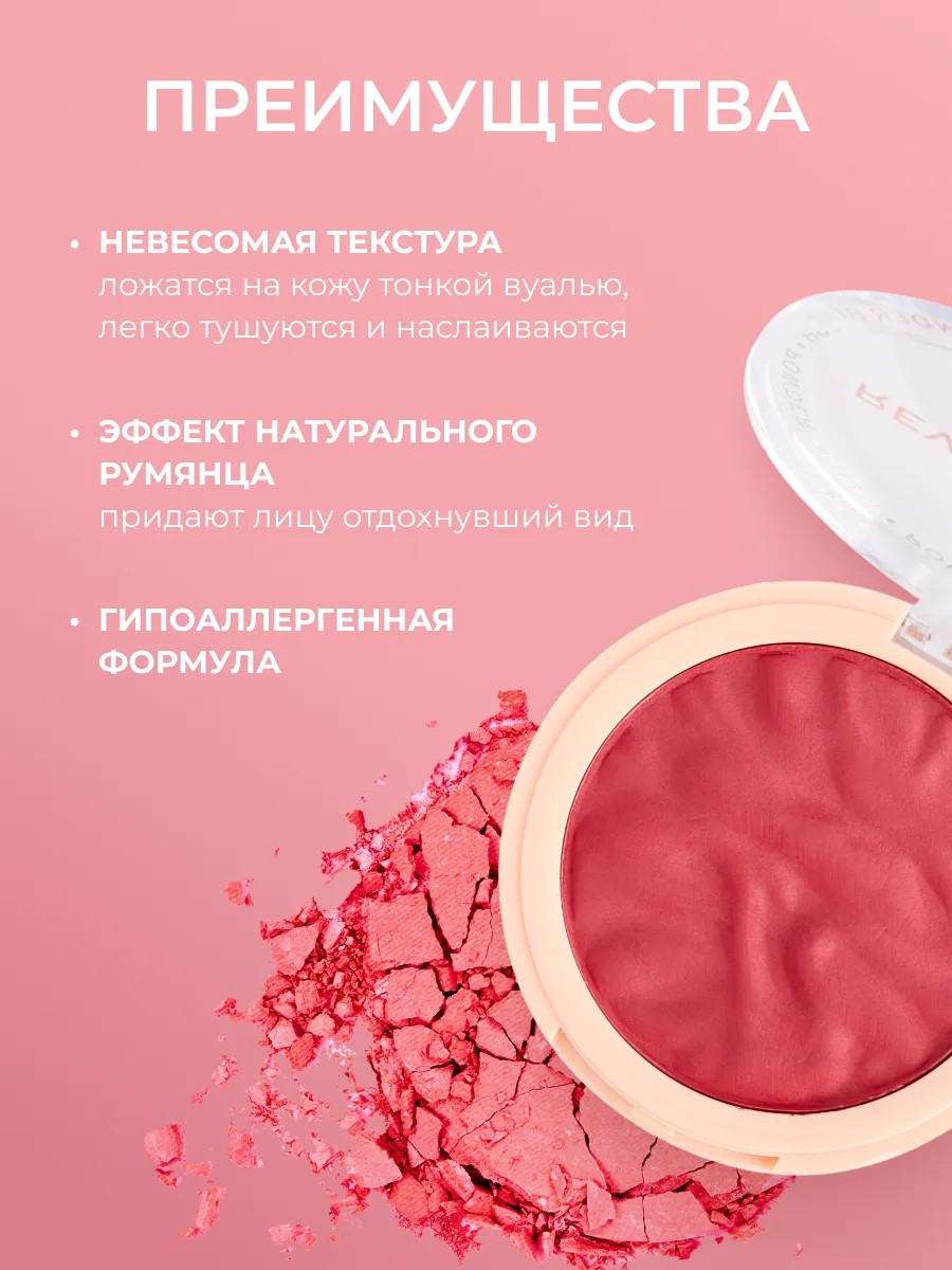 Описание Revolution Makeup Blusher Reloaded – удачное завершение любого образа. Они освежают, скульптурируют лицо и уравновешивают макияж. Всего одного взмаха кистью достаточно, чтобы скрыть следы усталости, покорив сердца окружающих своим безупречным видом. Revolution Makeup ориентирован на любой пол, возраст и цвет кожи. Шелковистая, чрезвычайно мягкая и приятная текстура ложится тончайшей вуалью. Высокая пигментированность продукта – залог экономичного расхода. Кроме того, он легко растушевывается и смотрится максимально естественно. Косметика не тестируется на животных и не содержит в составе компоненты, негативно влияющие на состояние кожи. Способ применения Наберите небольшое количество румян на пушистую кисть. Лучший способ найти правильные участки для их нанесения – улыбнуться. Слегка коснувшись зоны «яблок» на щеках, растушуйте, двигаясь по направлению к уху. Интенсивность цвета регулируйте самостоятельно. Характеристики Цвет: ROSE KISS Объем: 7.5g Страна ТМ: Великобритания Сделано в: Китай