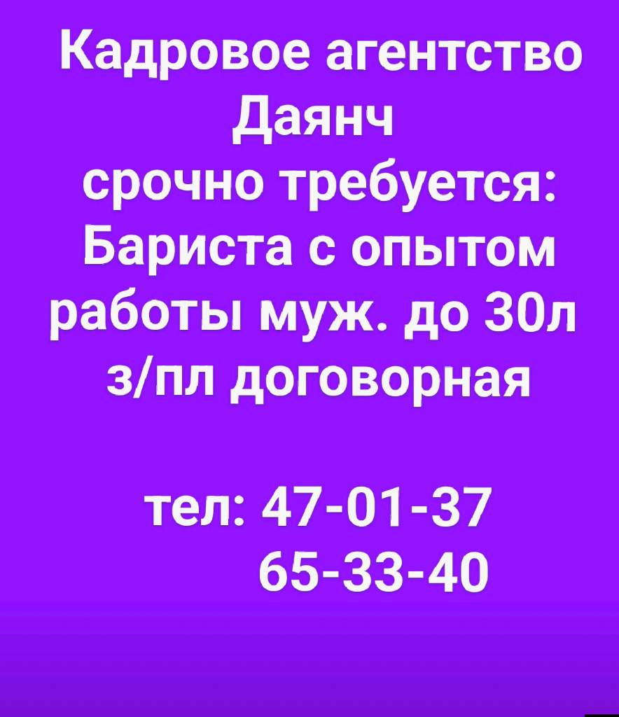 Кадровое агентство Даянч срочно требуется: Бариста с опытом работы муж. до 30л з/пл договорная тел: 47-01-37 65-33-40