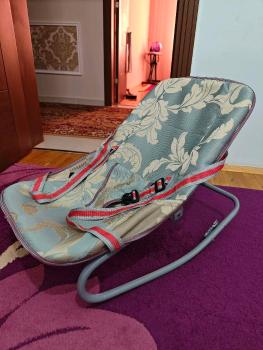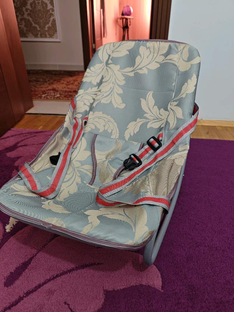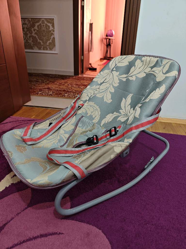 Это детское кресло-качалка (шезлонг) с тканевым сиденьем и ремнями безопасности.