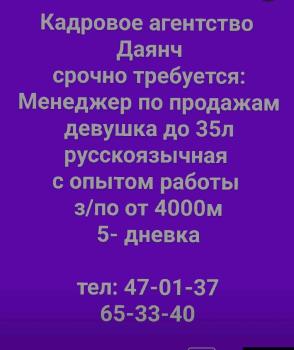 Кадровое агентство Даянч срочно требуется: Менеджер по продажам девушка до 35л русскоязычная с опытом работы з/по от 4000м 5- дневка тел: 47-01-37 65-33-40