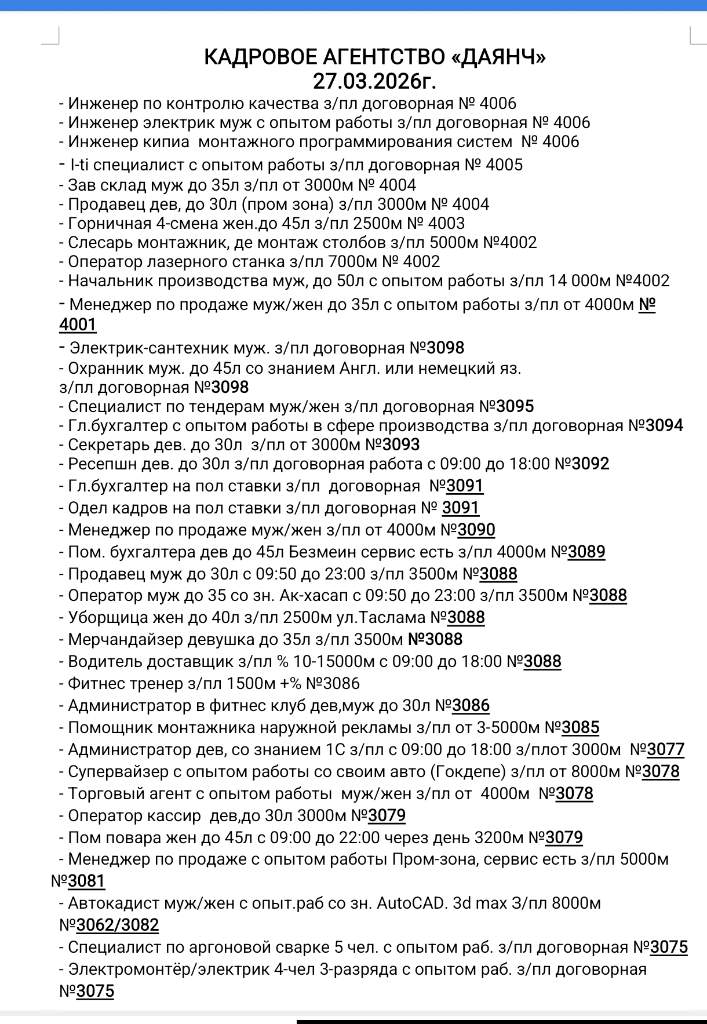 КАДРОВОЕ АГЕНТСТВО «ДАЯНЧ» 27.03.2026г. - Инженер по контролю качества з/пл договорная № 4006 - Инженер электрик муж с опытом работы з/пл договорная № 4006 - Инженер кипиа монтажного программирования систем № 4006 - I-ti специалист с опытом работы з/пл договорная № 4005 - Зав склад муж до 35л з/пл от 3000м № 4004 - Продавец дев, до 30л (пром зона) з/пл 3000м № 4004 - Горничная 4-смена жен.до 45л з/пл 2500м № 4003 - Слесарь монтажник, де монтаж столбов з/пл 5000м №4002 - Оператор лазерного станка з/пл 7000м № 4002 - Начальник производства муж, до 50л с опытом работы з/пл 14 000м №4002 - Менеджер по продаже муж/жен до 35л с опытом работы з/пл от 4000м № 4001 - Электрик-сантехник муж. з/пл договорная №3098 - Охранник муж. до 45л со знанием Англ. или немецкий яз. з/пл договорная №3098 - Специалист по тендерам муж/жен з/пл договорная №3095 - Гл.бухгалтер с опытом работы в сфере производства з/пл договорная №3094 - Секретарь дев. до 30л з/пл от 3000м №3093 - Ресепшн дев. до 30л з/пл