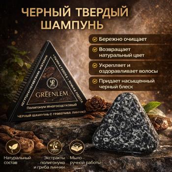 Этот продукт представляет собой твердый шампунь-мыло Greenlem на основе растительных экстрактов, предназначенный для комплексного ухода за волосами и кожей головы. Его формула объединяет традиционные китайские травяные компоненты для укрепления и восстановления волос. Описание и ключевые свойства Средство разработано для глубокого очищения и питания волос от корней до самых кончиков. Основными действующими компонентами являются: Polygonum Multiflorum (Горец многоцветковый): способствует сохранению натурального темного цвета волос и поддерживает здоровье кожи головы. Black Ganoderma Lucidum (Черный гриб Рейши): питает волосяные фолликулы и придает волосам блеск. Основные преимущества продукта: Контроль жирности и перхоти: эффективно очищает кожу головы от излишков себума и загрязнений. Укрепление и гладкость: восстанавливает структуру волос, делая их более сильными и послушными. Придание объема: после использования волосы становятся мягкими и пышными. Усиление блеска: придает волосам глубокий «черный» блеск и эластичность. Применение Твердый шампунь имеет форму треугольной пирамиды, что обеспечивает удобный захват и нанесение. Смочите волосы и само мыло водой. Намыльте волосы непосредственно бруском или создайте пену в руках. Помассируйте кожу головы и распределите пену по всей длине волос. Тщательно смойте теплой водой. Средство подходит для ежедневного или регулярного использования как мужчинами, так и женщинами с любым типом волос. Оно компактно, экономично в расходе и не содержит агрессивных химикатов.