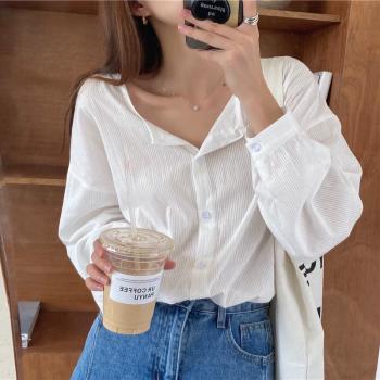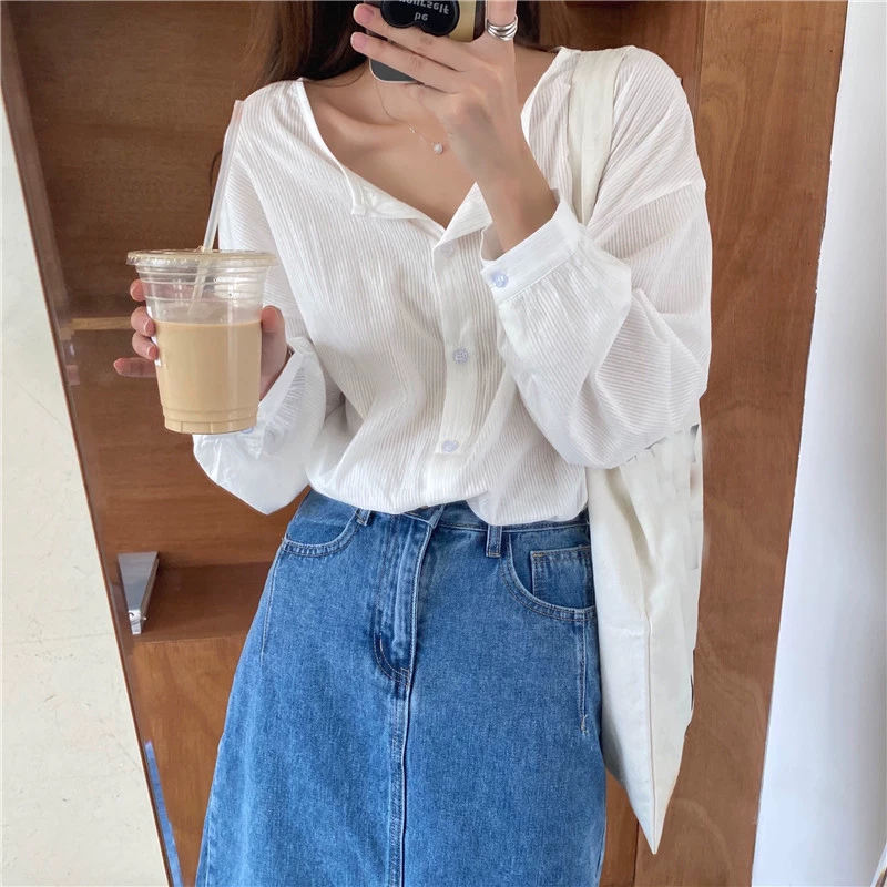 Синяя рубашка, ретро весенний лонгслив с круглым воротником, в корейском стиле, оверсайз