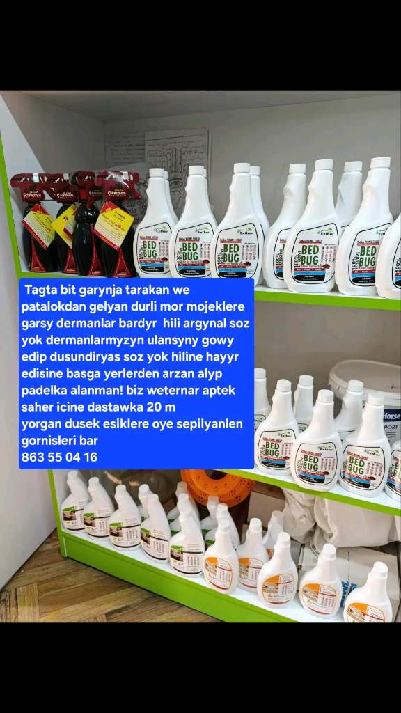 Hormatly musderlerimiz ! Bizin weternar aptegimizda tagta bitden baslap tarakana at garynja as we patolokdan gelyan mor mojeklere garsy we liboy mor mojegi oldiryan dermanlamyz bar . Oyden cykylyan gornusimiz hem bar yok men oyden cykyp bilemak so gornusden barmy diyseniz olam bar adama zyyansyz ! Ahli soraglanyz janda ! Haywanlan iymiti gurrallary kolary we hemem zatlamyz ba . Soraglamyz janda . Bizin is yerimiz Anew weterinar .Saher icinden 30 mkpden alyp bilyaniz . Dastawka hyzmatymyz hem ba saher icine 20 m . Bizin spreylamyzyn hersin oz ayratynlygy ba esiklere yorgan duseklere yasyklara dusen tagta biti hem alyan gornisde spreylamyz bar . Onanm patolokdan gelyan mebilda stelarda polarda duran tagta bitem alyan spreylamyz ba guyji gaty yitiden gowy soz yok dermanlarmyza . Bizin maslahat bersimiz yaly ulansanyz 1 alsanyz dynyanyz . Mundan basgada arzan gorip basga yerlerden bazarlardan elde satyanlardan alyp alanman padelkalary gaty kop bizden alyp ulanyp barlap gor