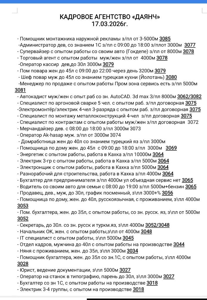 КАДРОВОЕ АГЕНТСТВО «ДАЯНЧ» 17.03.2026г. - Помощник монтажника наружной рекламы з/пл от 3-5000м 3085 -Администратор дев, со знанием 1С з/пл с 09:00 до 18:00 з/плот 3000м 3077 - Супервайзер с опытом работы со своим авто (Гокдепе) з/пл от 8000м 3078 - Торговый агент с опытом работы муж/жен з/пл от 4000м 3078 -Оператор кассир дев,до 30л 3000м 3079 - Пом повара жен до 45л с 09:00 до 22:00 через день 3200м 3079 - Шеф повар муж до 45л со знанием турецкая кухни (Йолотань) 3080 -Менеджер по продаже с опытом работы Пром зона сервись есть з/пл 5000м 3081 - Автокадист муж/жен с опыт.раб со зн. AutoCAD. 3d max З/пл 8000м 3062/3082 - Специалист по аргоновой сварке 5 чел. с опытом раб. з/пл договорная 3075 -Электромонтёр/электрик 4-чел 3-разряда с опытом раб. з/пл договорная 3075 - Специалист по монтажу металлоконструкций 4-чел з/пл договорная 3075 - Специалист по контрактам с опытом работы муж/жен з/пл договорная 3072 - Мерчандайзер дев. с 08:00 до 18:00 з/пл 3000м 3073 - Оператор Ak-h
