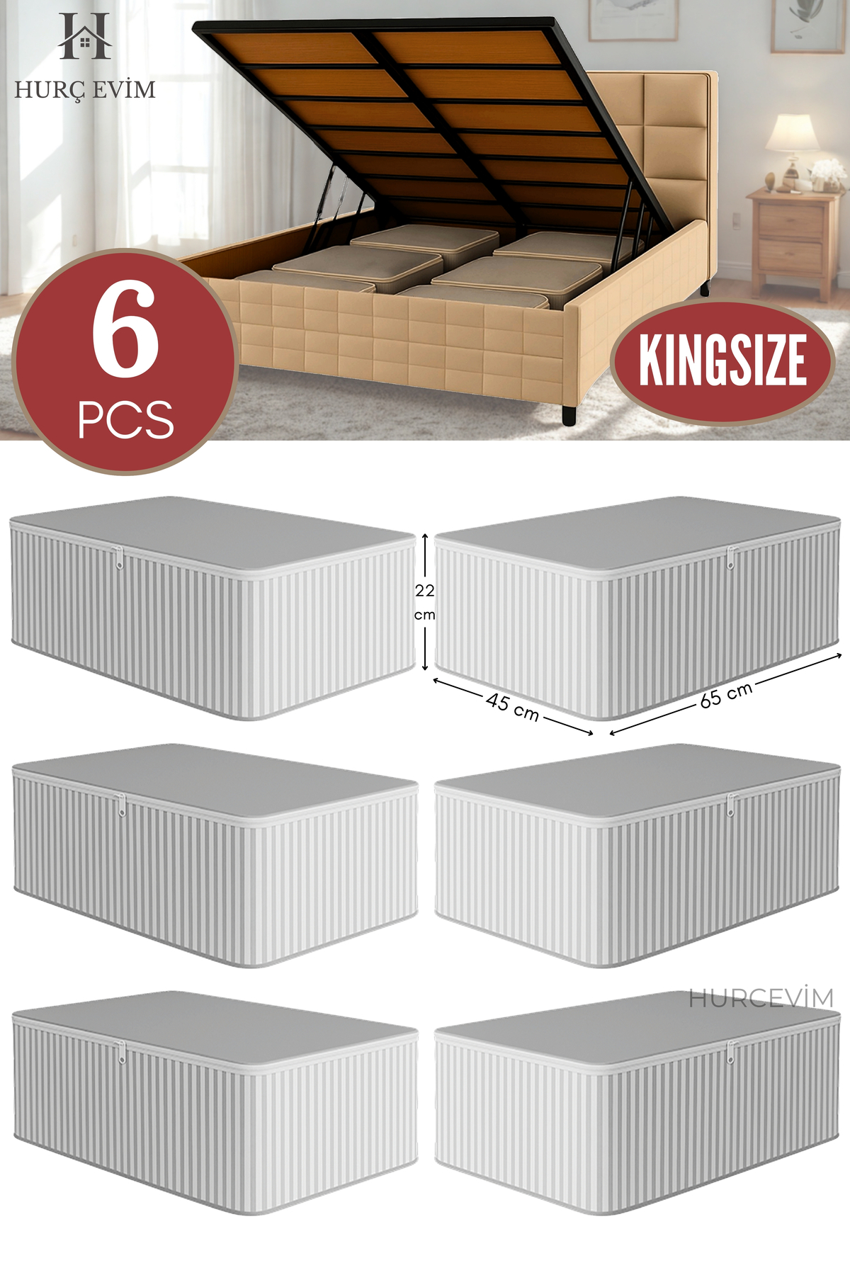 HURCEVİM 6 Adet - Antrasit Çizgili Büyük Boy Hurç Seti - Baza Altı Ve Çekyat Tipi Organizer - 65 x 45 x 22 Cm