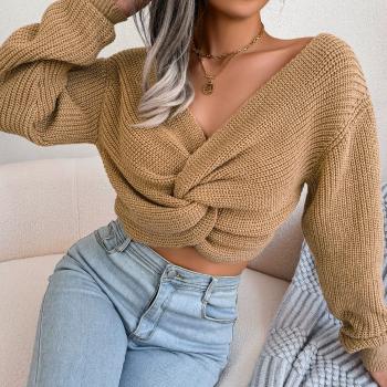 Короткий женский свитер с V-образным вырезом и рукавами-фонариками Цвет : Хаки Размер : S